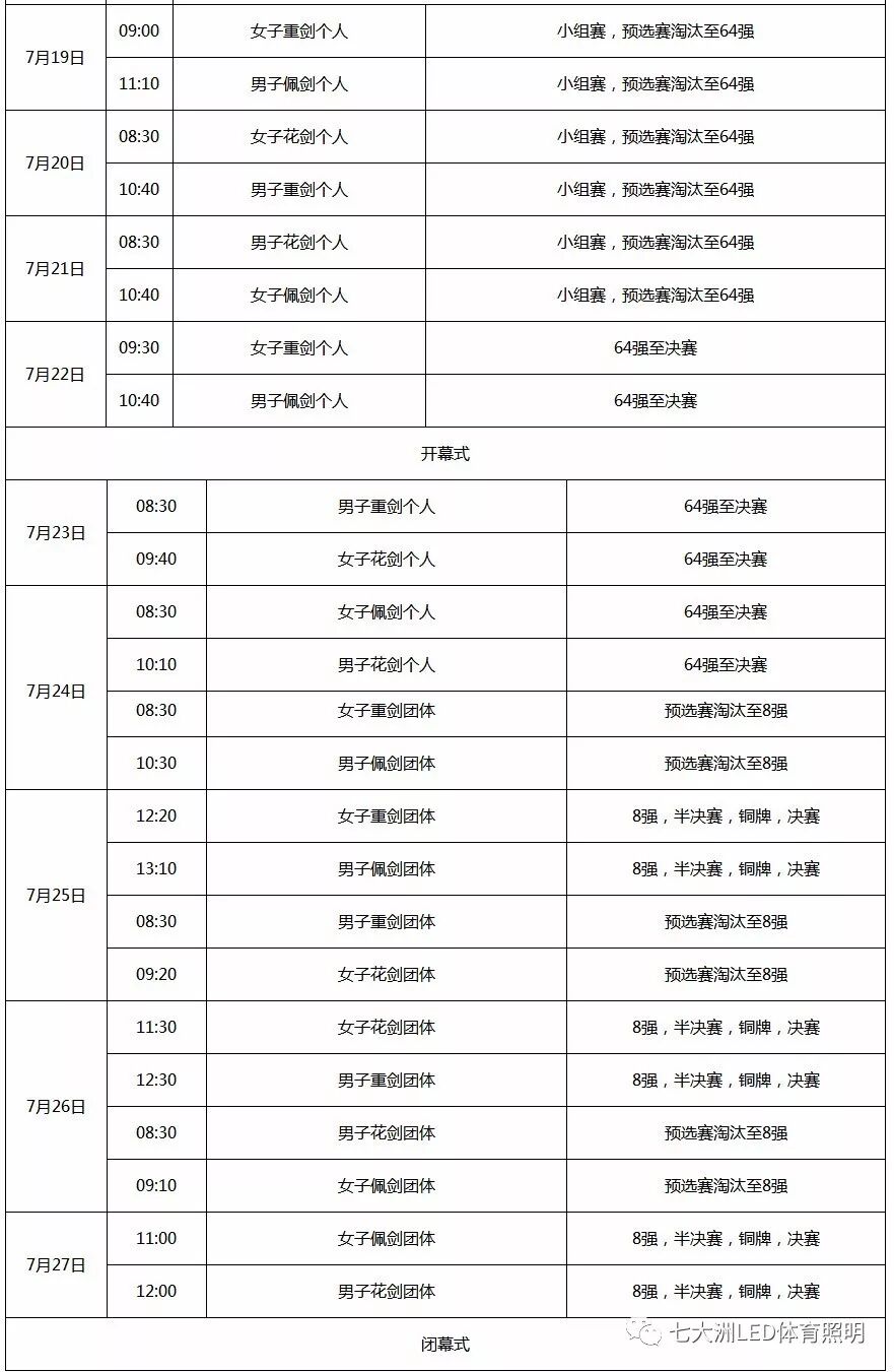 7月24日至7月27日为团体赛预赛及决赛阶段
